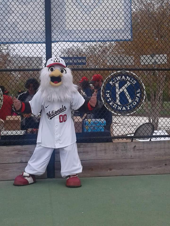 The rain held off as 23 kids practiced batting, catching and fielding, and base running skills. Screech, the Washington Nationals mascot, was also on hand taking selfies and helping out at stations.